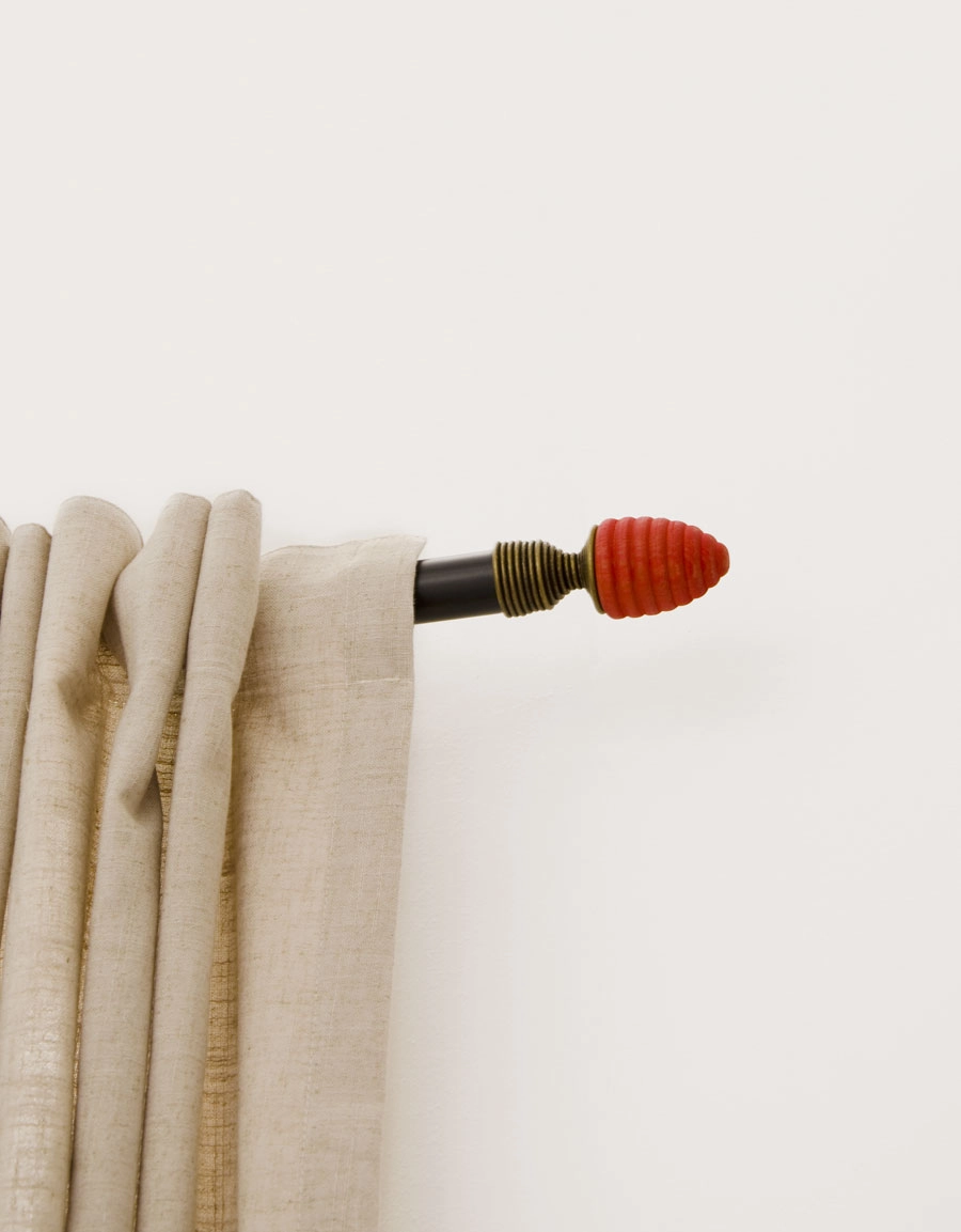 Ändknopp i trä för stänger i diametern 26/28 mm. Finns i färgerna röd med fäste i antikmässing och svartsilver med fäste i svart. Träs enkelt fast på stången, ingen adapter behövs! Ett par i förpackningen.
