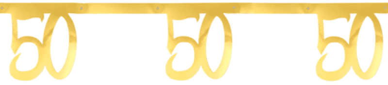 Jättefin och stor banderoll av papp i guld med siffror. Banderollen mäter 20 cm hög och hela 250 cm lång. Siffran ”50” står upprepade 8 gånger.