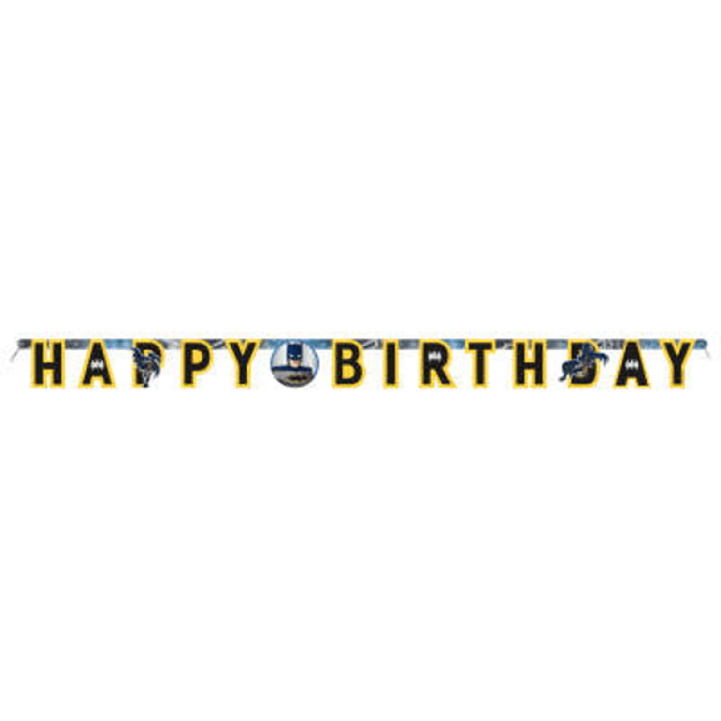 Jättefin banderoll av papp som är formklippt till orden HAPPY BIRTHDAY och har fina bilder av Batman. Banderollen är ca 13 cm hög och 175 cm lån.