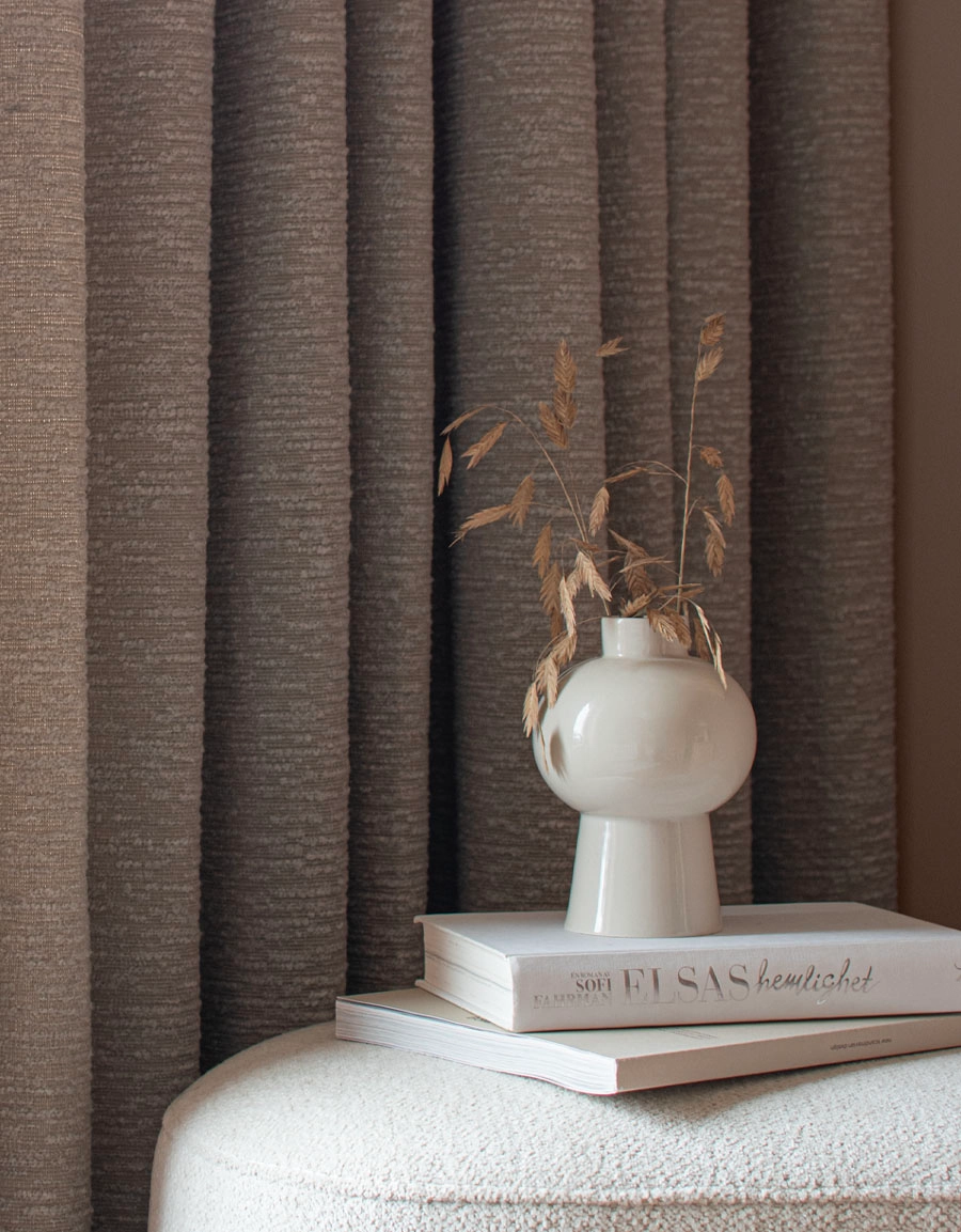 Vacker gardin i mjukt bouclétyg med ullig struktur som ger ett vackert fall. Tyget har en rumsförmörkande effekt som stänger ute en stor del av ljuset.