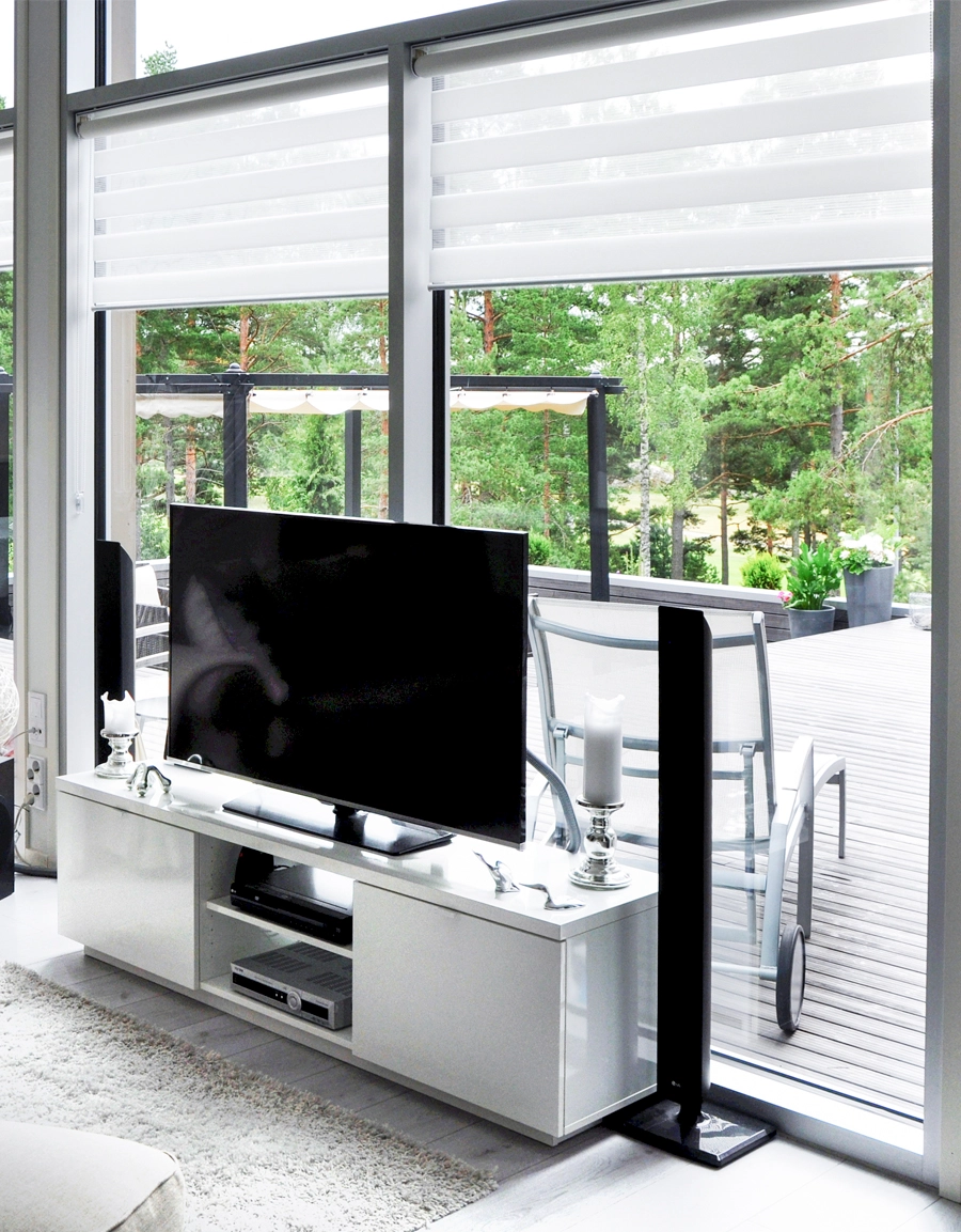 Måttanpassad rullgardin med avskärmande väv i två lager för enkel reglering av ljusinsläpp.