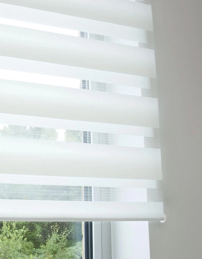 Rullgardinen har två lager som gör det enkelt att justera ljusinsläpp och insyn efter behov.