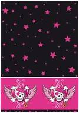 En duk i måtten 130 x 180 cm. Svart med rosa stjärnor och rosa kantfärg med den coola dödskallens motiv.