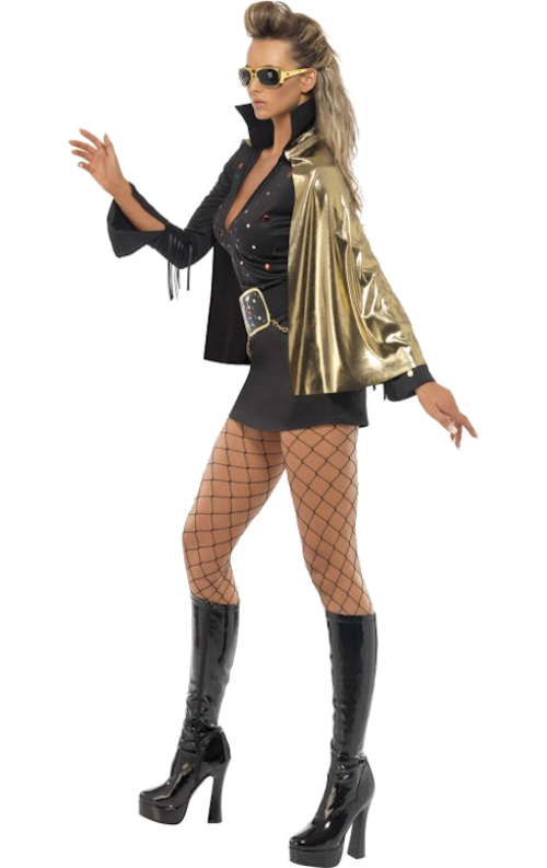 Viva Las Vegas Elvis maskeradräkt består av en kort svart klänning och ett bälte med guldfärgat metallspänne. En mantel ingår också. Lägg till andra accessoarer för att komplettera looken.