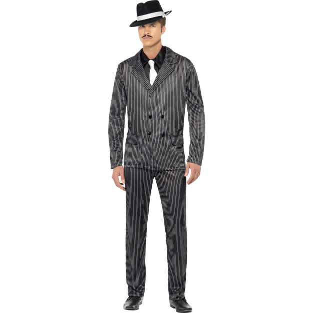 Gangsteroutfiten består av en jacka med knappdetaljer och ett par mörkgrå byxor.