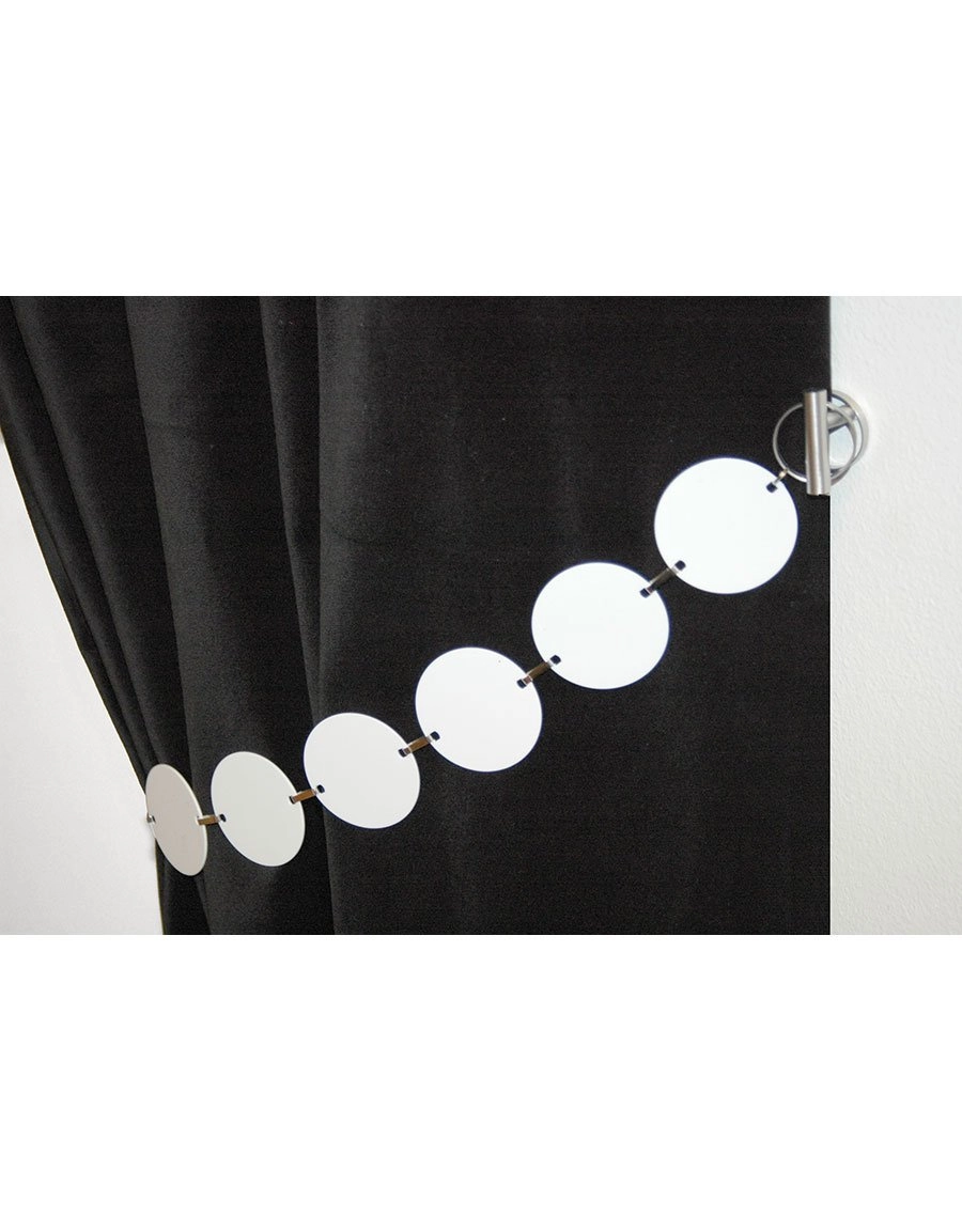 Gardinomtag för gardiner med dekorativa plastbrickor. Finns i vit, svart, röd, ljusrosa och ljusblå. Längd 75 cm. Metallringar i vardera ände för att fästa omtaget i en krok.