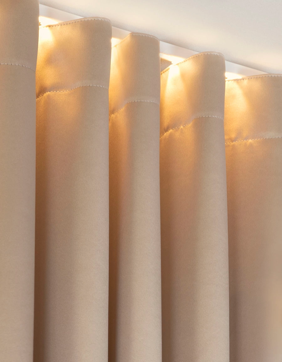 Gardinskenan är utrustad med LED-belysning som kastar ett mjukt ljus över gardintyget och skapar en elegant atmosfär i rummet.
