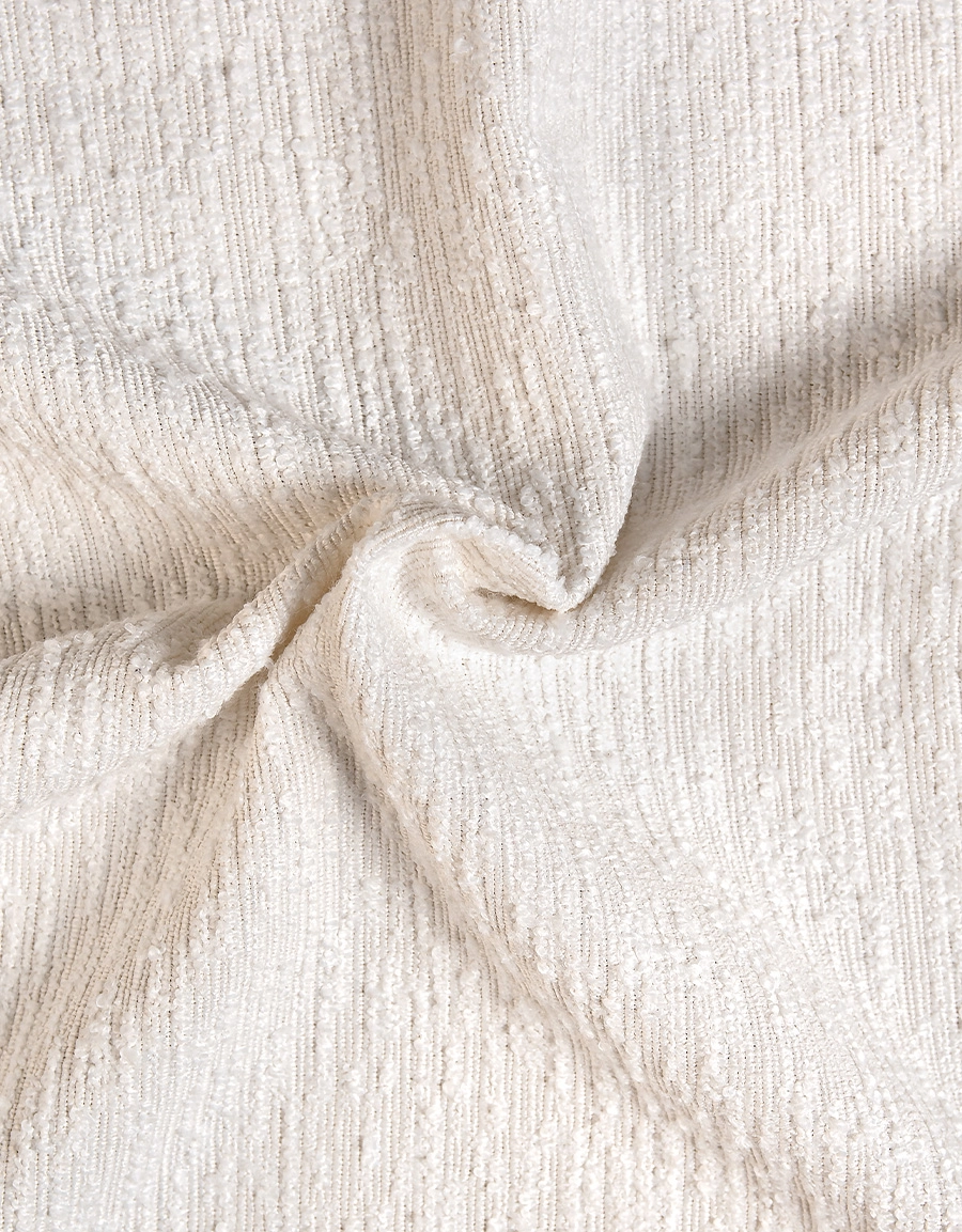 Tyget har en mjuk, karaktäristisk boucléstruktur och en tät väv som stänger ute en stor del av ljuset för en ombonad känsla.