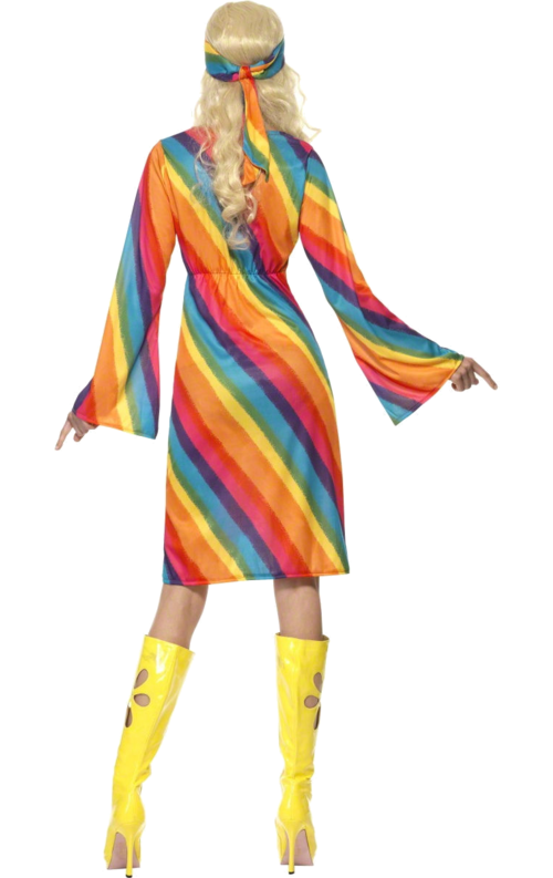 Med vår regnbågsfärgade hippiedräkt kan du sprida glädje och kärlek på ditt nästa evenemang. Denna färgglada klänning kommer omedelbart lyfta ditt humör och göra dig till festens mittpunkt. Klänningen har alla regnbågens färger och inkluderar även ett huvudband. Så hoppa i denna dräkt och sprid positiv energi överallt där du går!