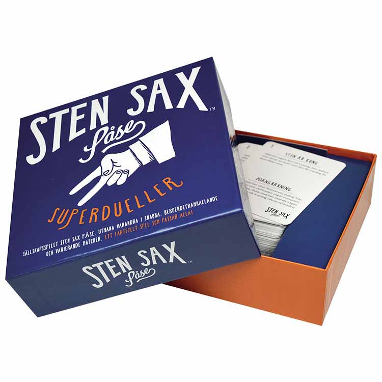 I denna sällskapsspelsvariant av den klassiska handleken ”Sten, sax, påse” utmanar vi varandra i snabba och spännande matchdueller. Ett nervkittlande och engagerande spel som bjuder på dramatik och underhållning på högsta nivå. Utmana dina vänner i ett roligt och fartfyllt spel som passar alla och kan spelas överallt! Människokännare, iskall taktiker eller chansare?