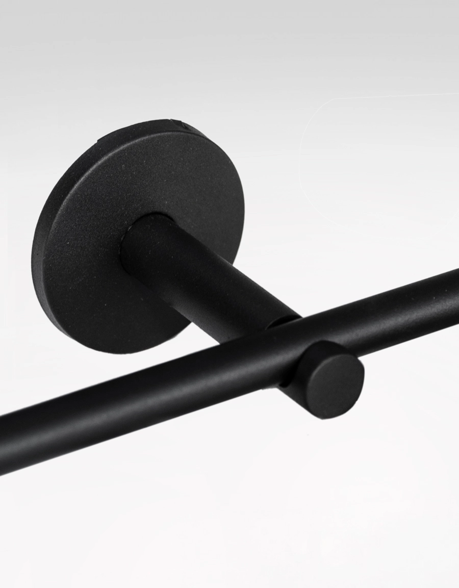 Väggfäste Point i rostfritt stål eller svart. Fästet är 8 cm och passar för gardinstänger med diametern 11/13 eller 26/28 mm.